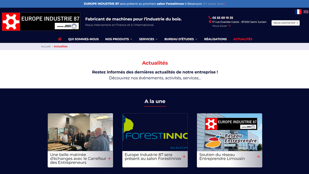 Nous avons récemment finalisé la réalisation du site Internet de l’entreprise Europe Industrie 87 - fabricant de machines, basée à Saint-Junien et reconnue dans le secteur industriel du bois. Ce projet web sur mesure a été conçu sur WordPress - solution CMS flexible et évolutive - et visait à offrir à l’entreprise une vitrine digitale professionnelle, moderne et performante.